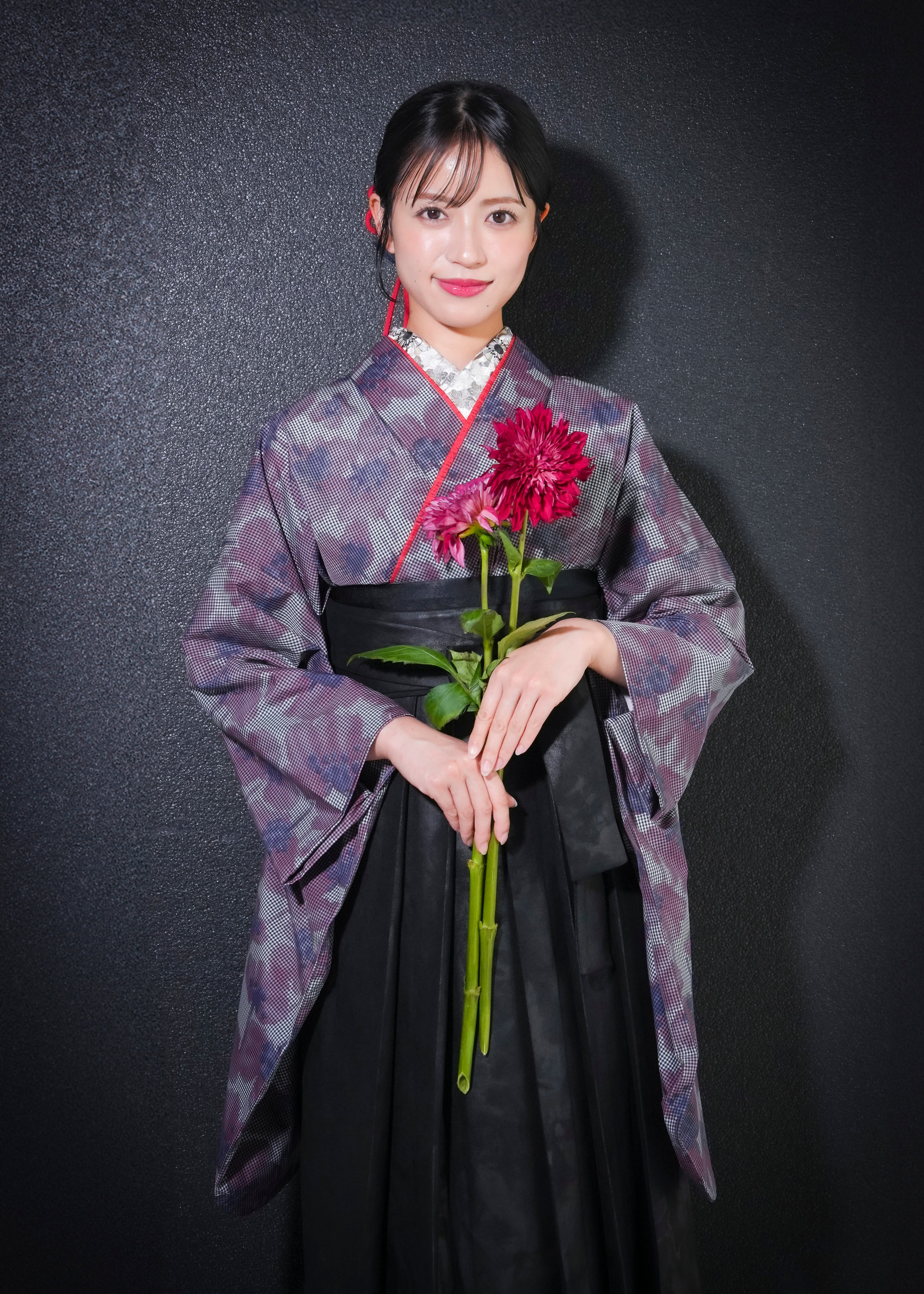 落ち着いたグレー地に紫の花模様が浮かぶ着物と、