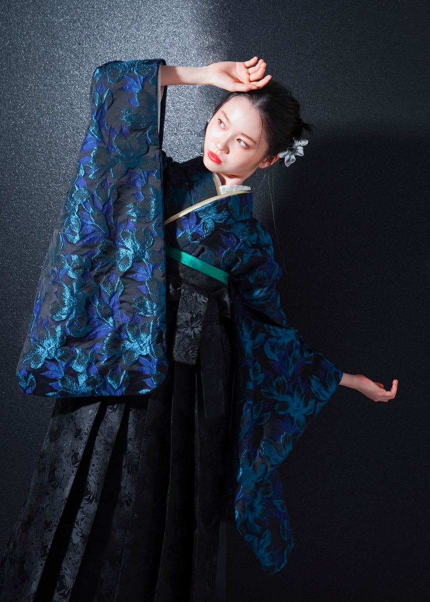 深みのあるブルーに咲き誇る花模様の着物と、ジャカード調の黒袴を組み合わせた、モードで洗練された袴スタイル。