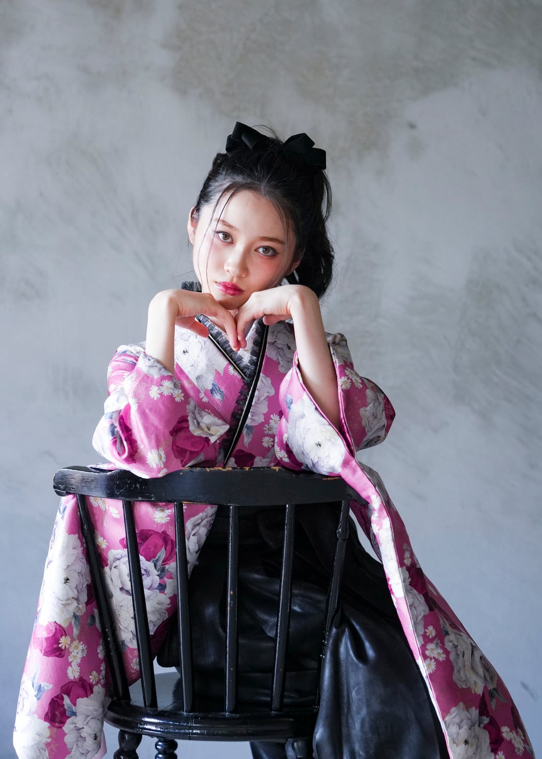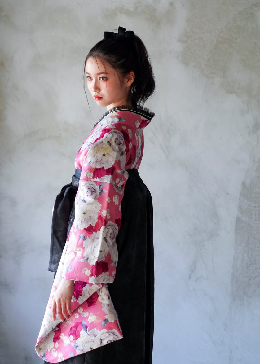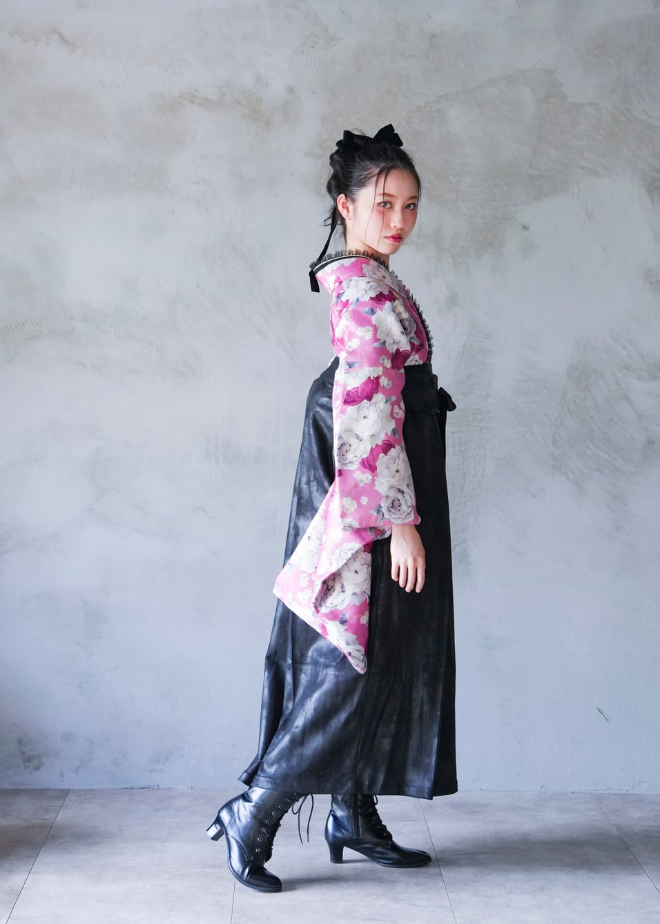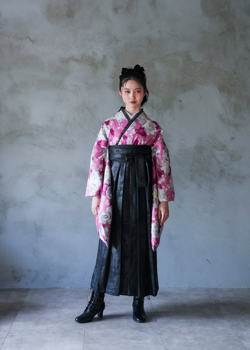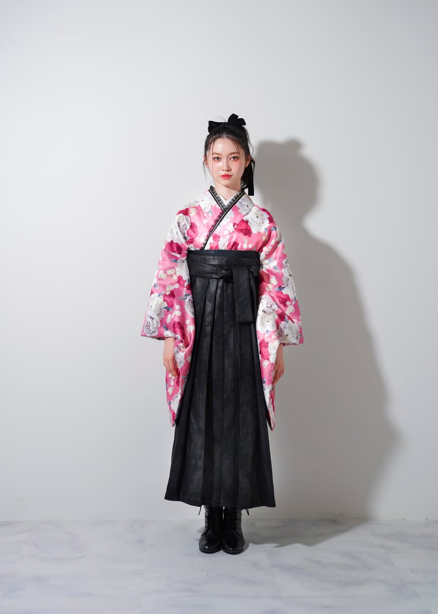 華やかなピンクの花柄着物と、シックなブラック袴を組み合わせたモダンスタイル。