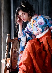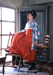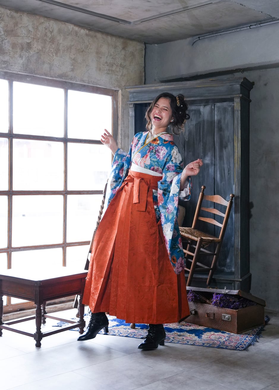 鮮やかなブルーの花柄着物と、朱赤の袴を組み合わせた華やかで印象的な袴スタイル。
