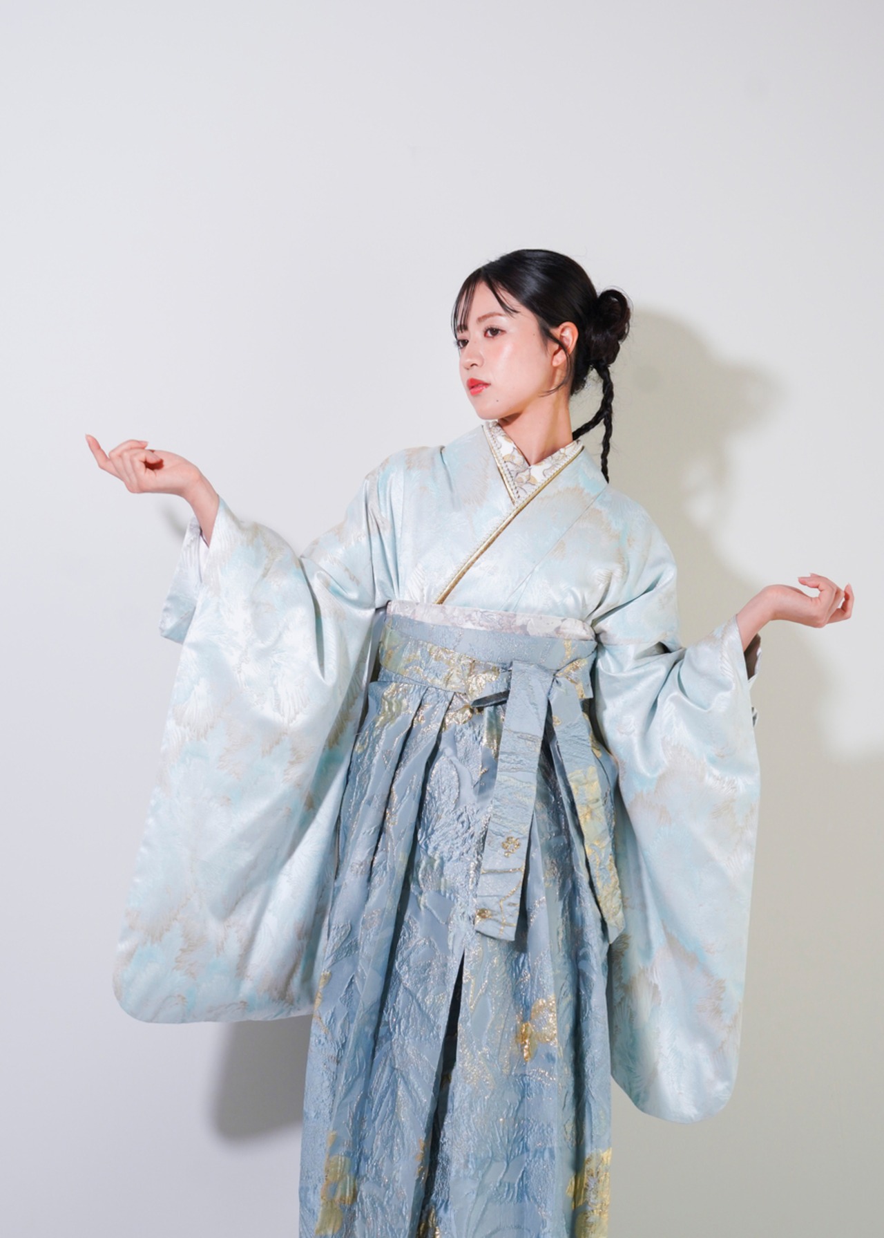 淡い水色の着物と袴を組み合わせた、清楚で透明感のあるスタイル。