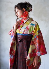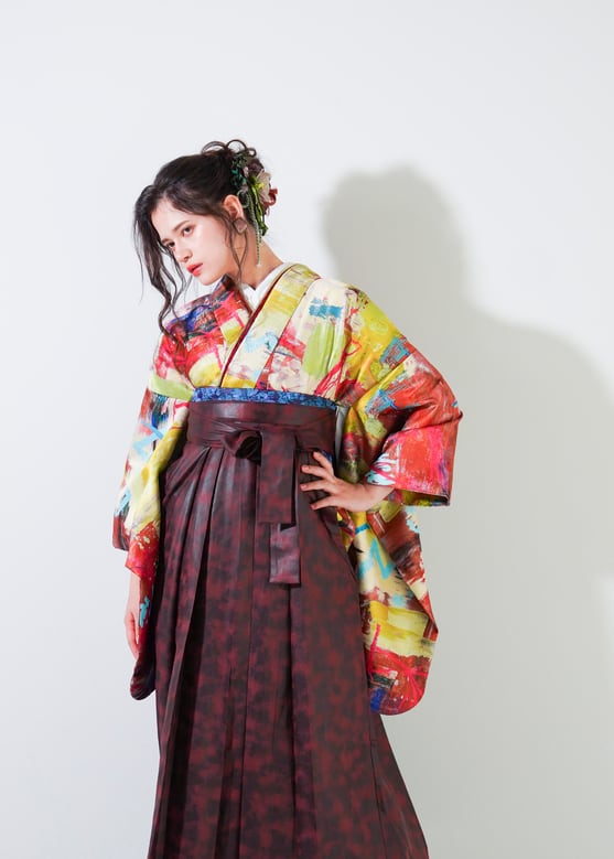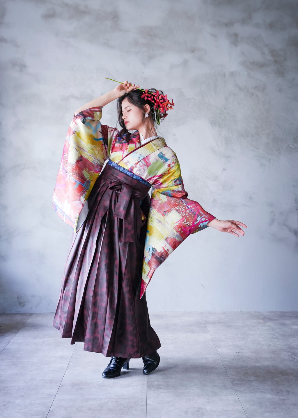 まるで絵画のようにカラフルなタッチで彩られた着物と、深みのあるワインレッドの袴を合わせた、アーティスティックなスタイル。