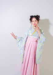 ラベンダーグリーンの花柄着物に、淡いピンクの袴を合わせた、可憐で幻想的なスタイル。