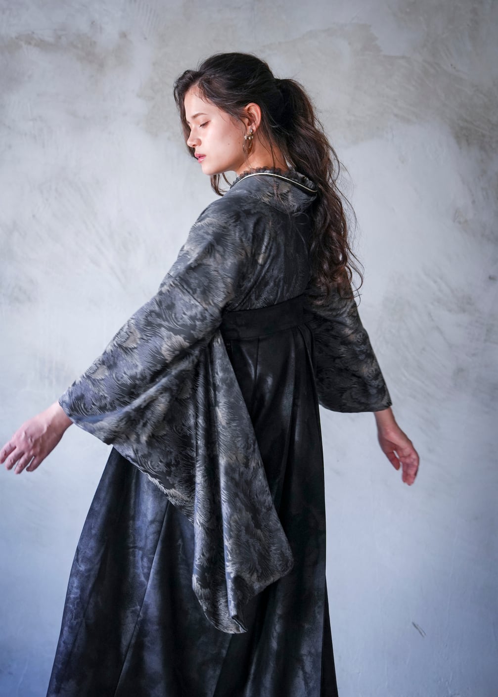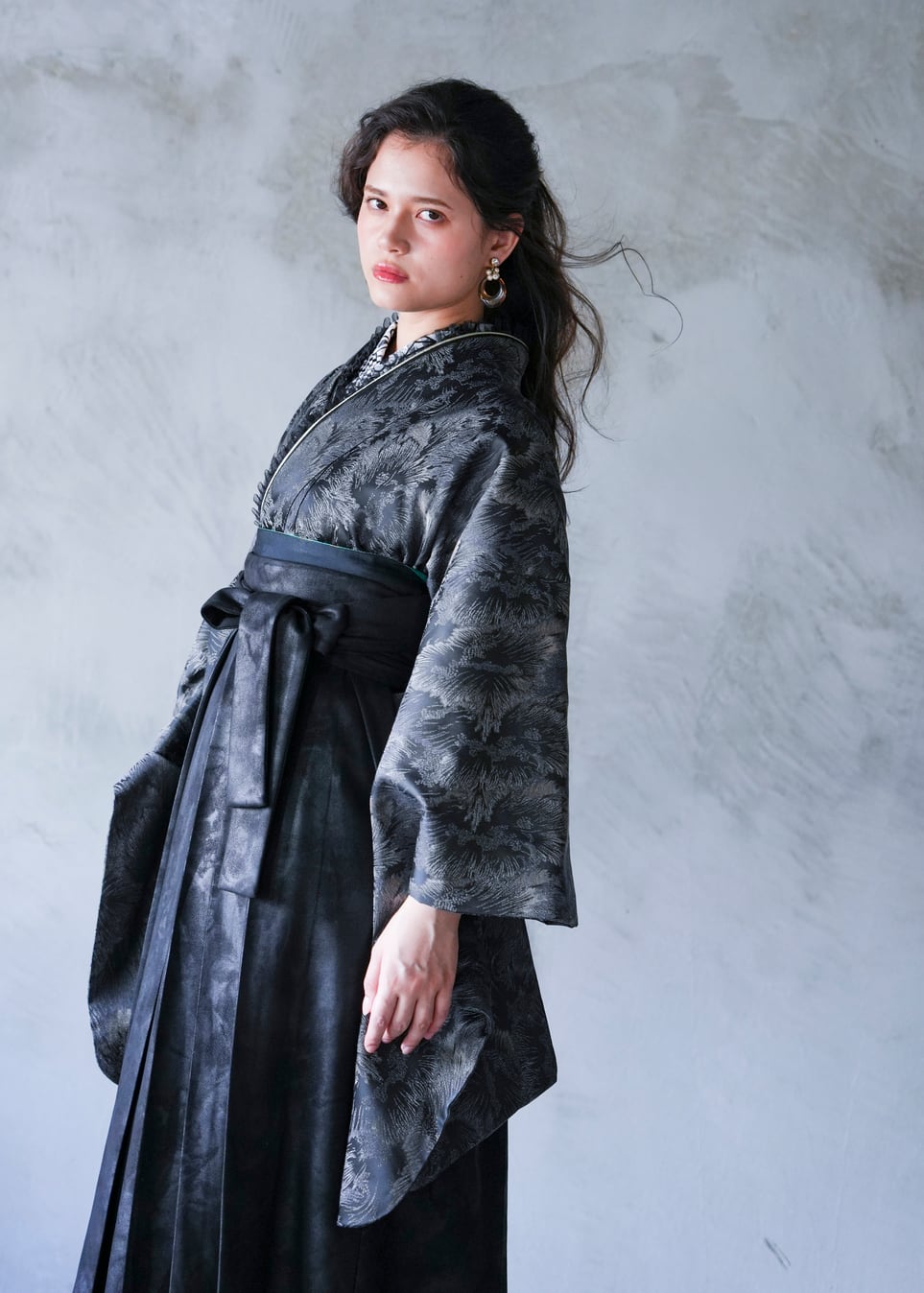 黒地に繊細な孔雀模様が浮かぶ着物と、深みのある黒の袴を組み合わせたオールブラックコーデ。