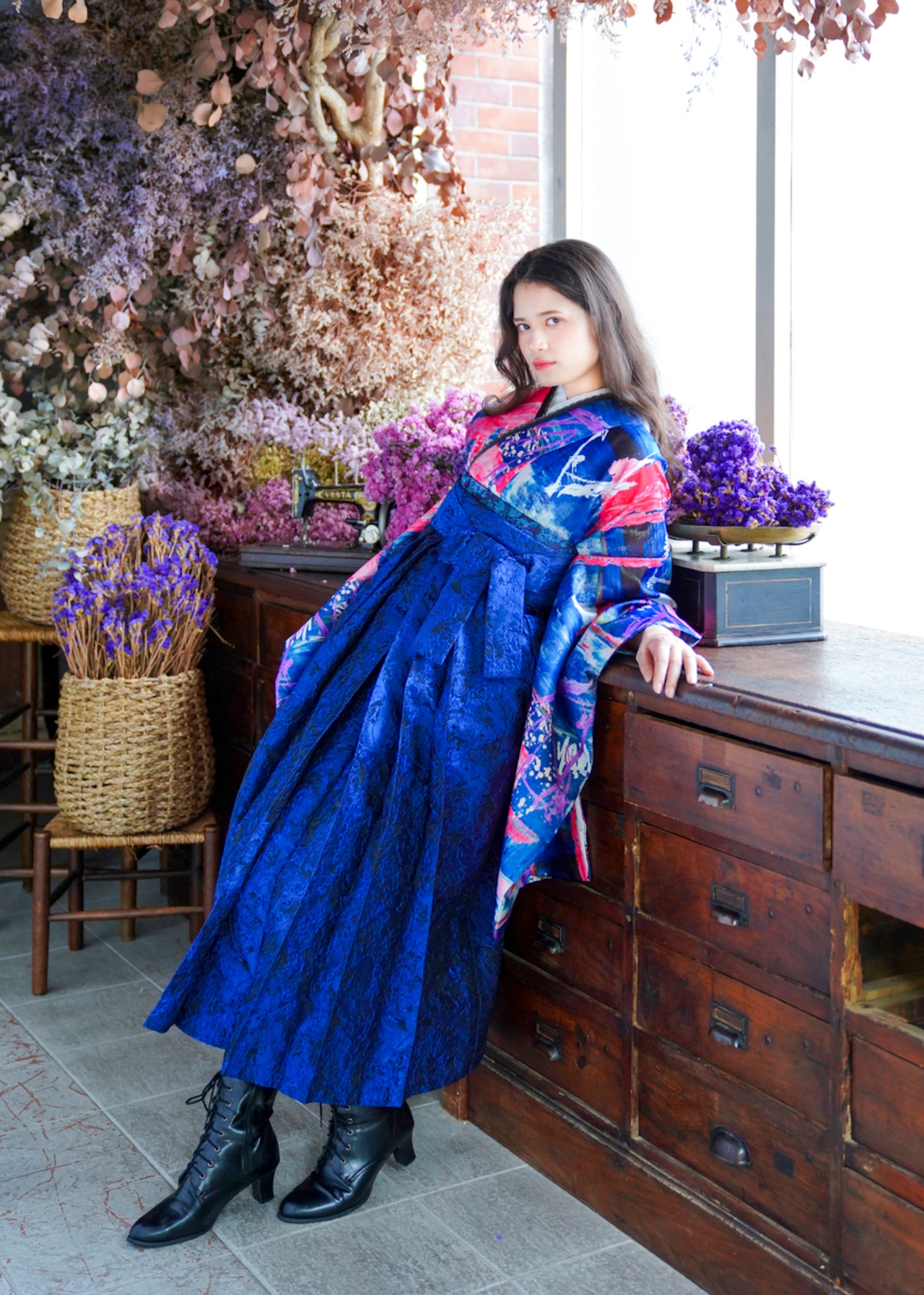 鮮やかなレッドとブルーを大胆に取り入れたアート調の着物に、深いロイヤルブルーの袴を合わせた、存在感抜群のスタイル。
