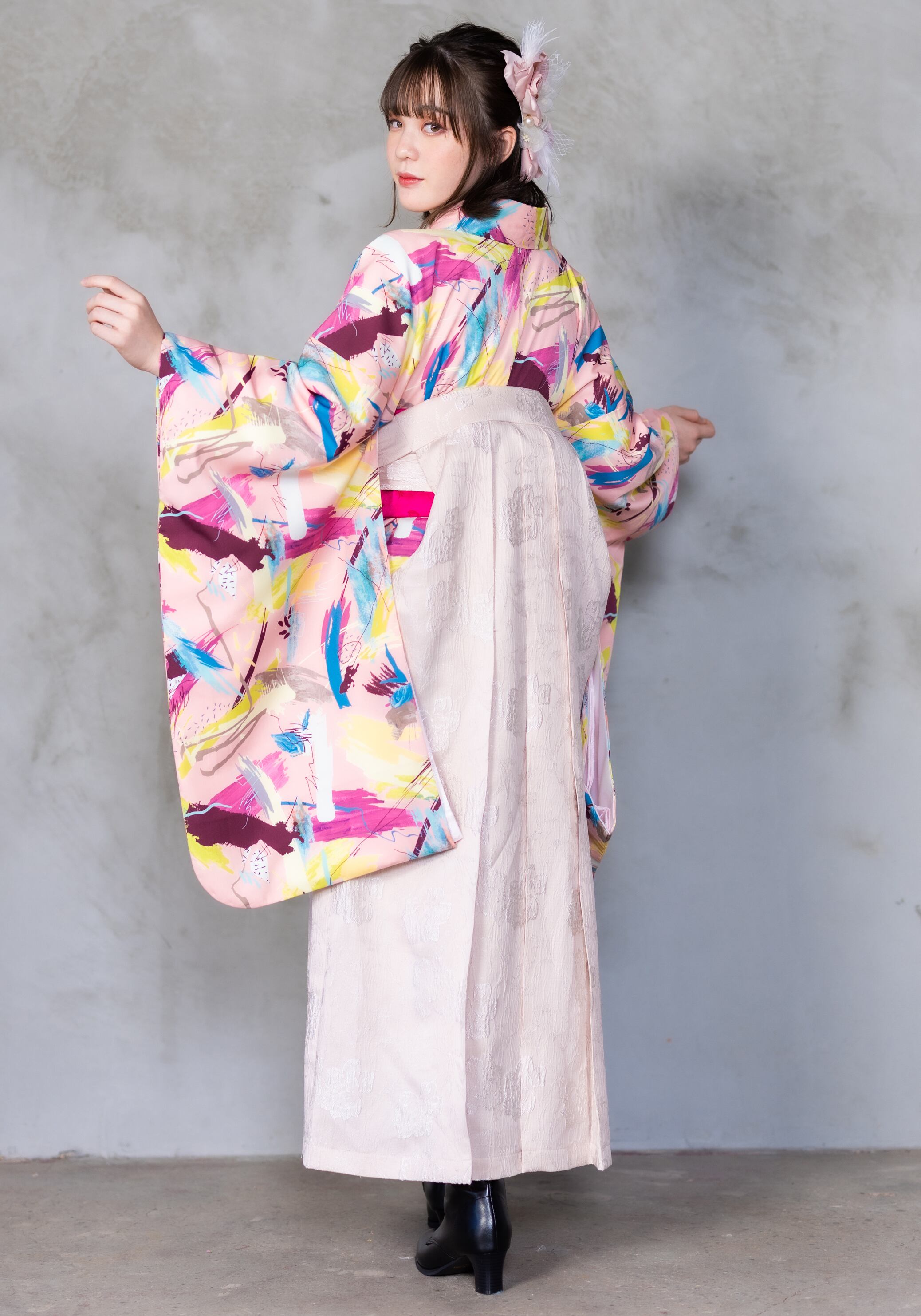 レンタル卒業袴の中でも人気なサーモンピンク!可愛いペイントが施された、華やかでビビットな色合いが、卒業式や成人式などの特別な記念日にぴったりです。