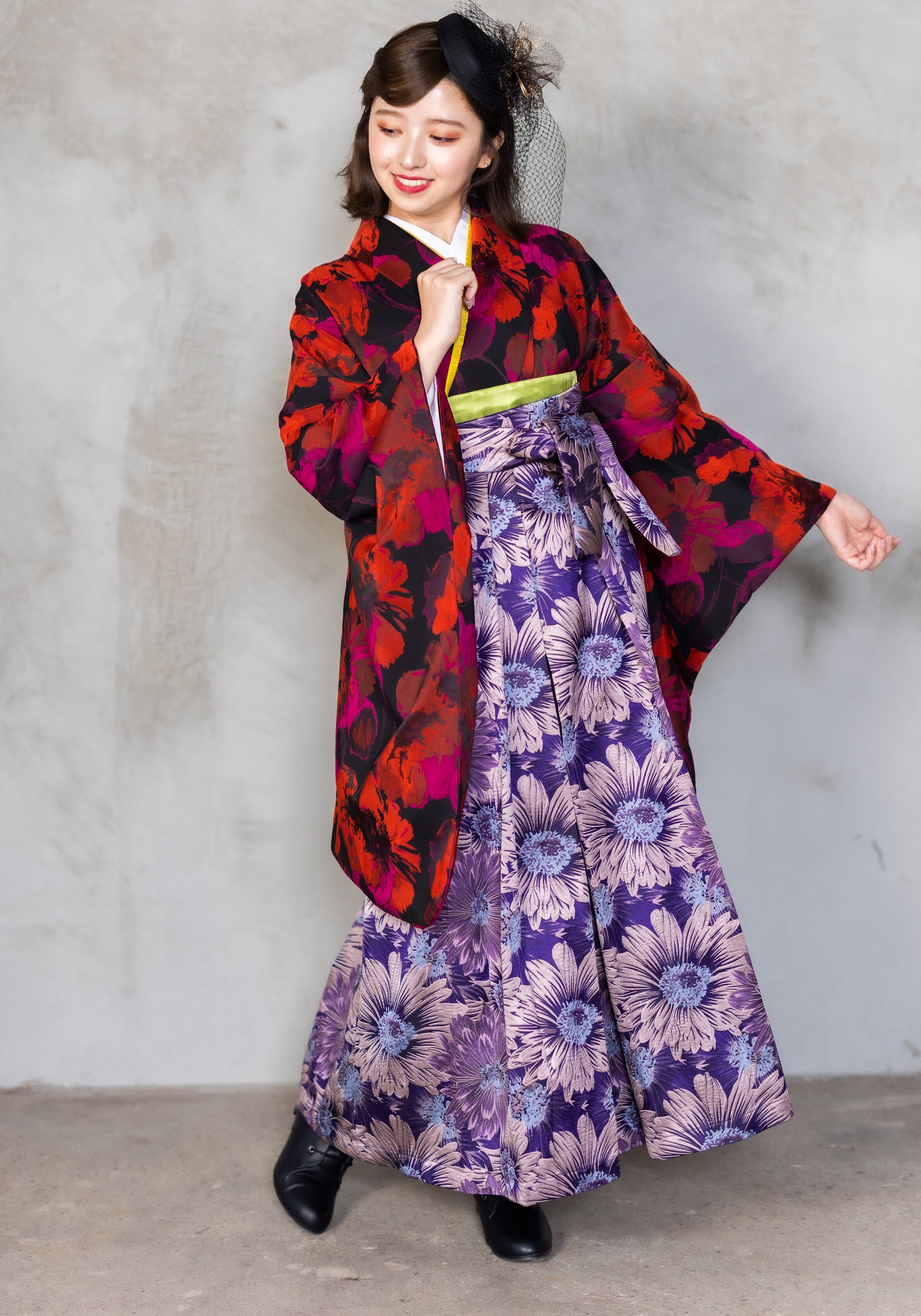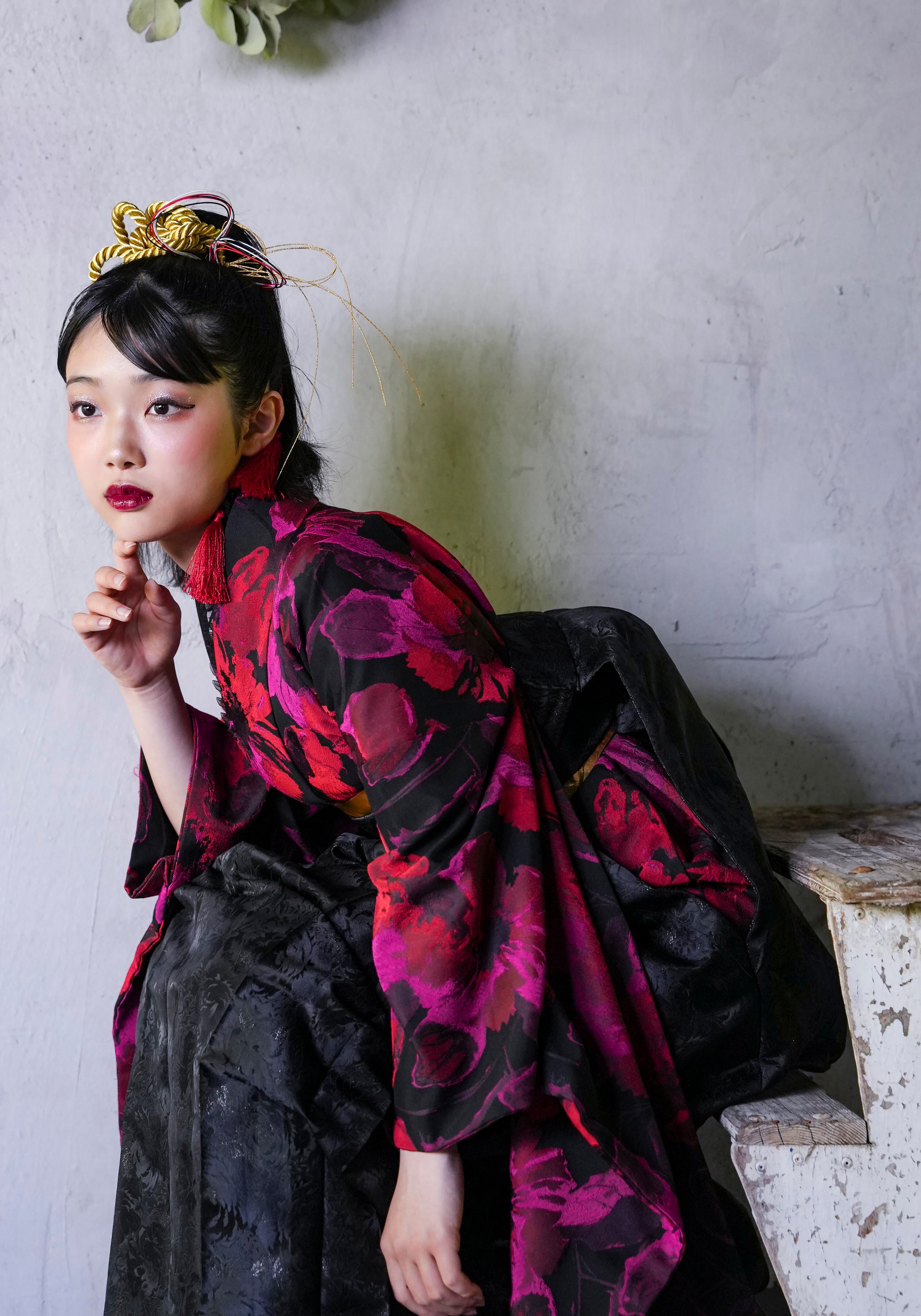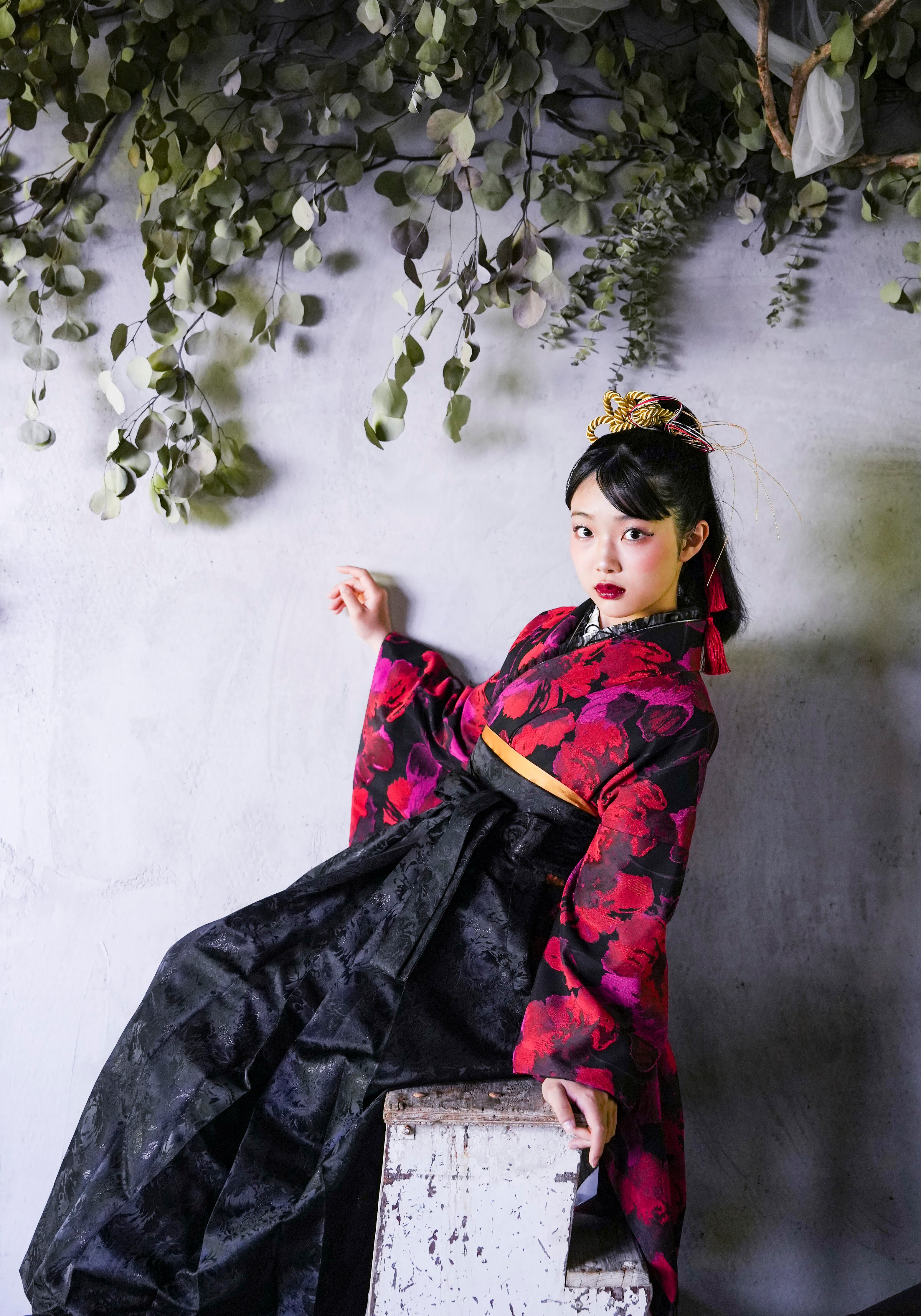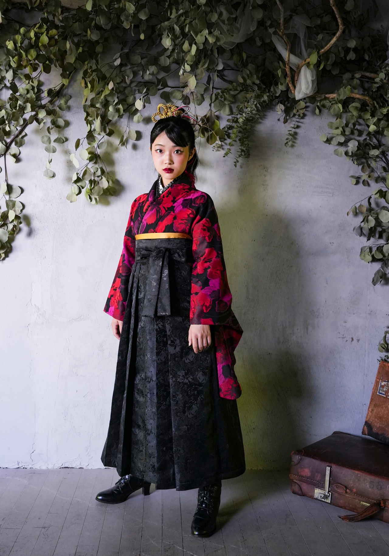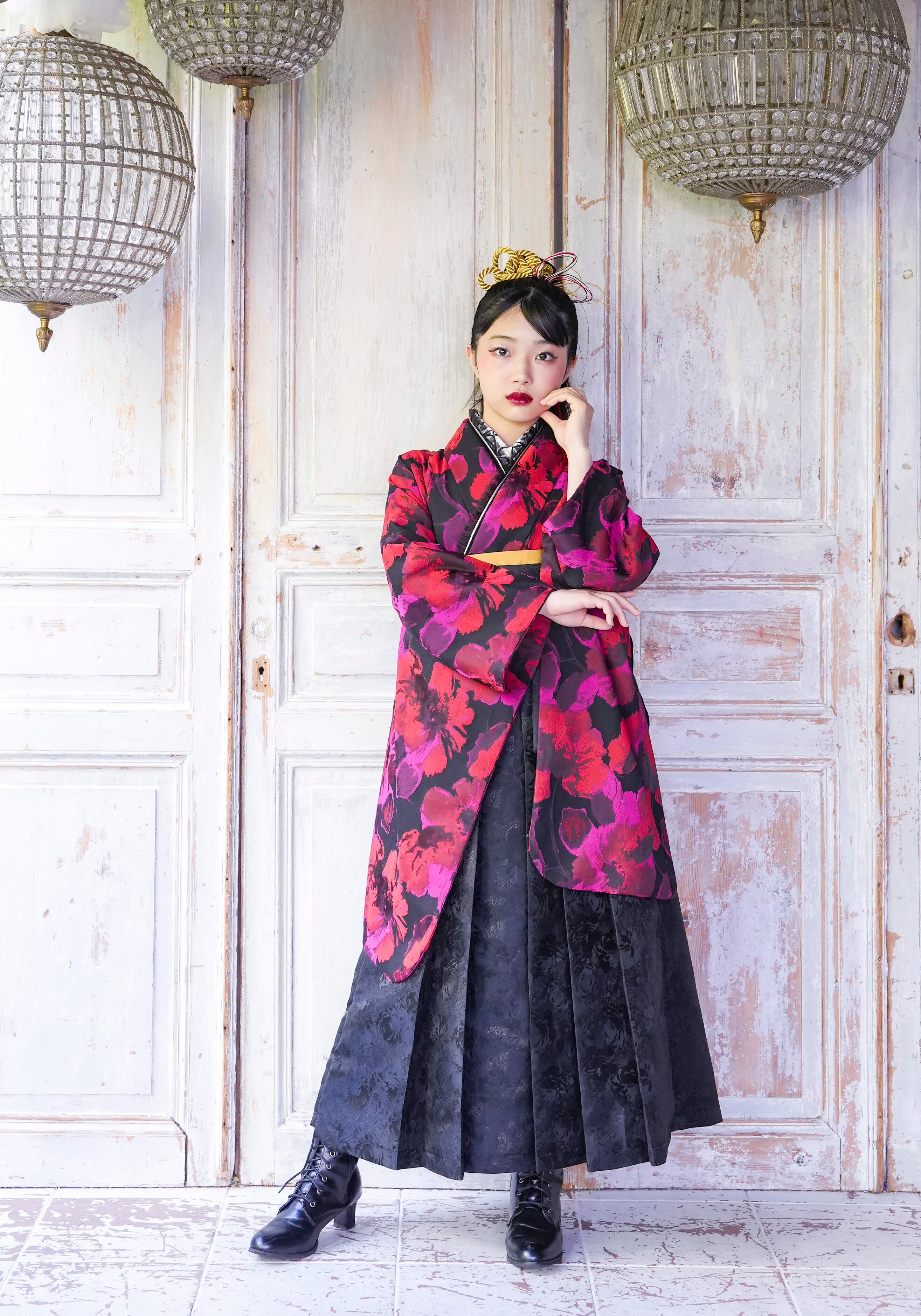 この卒業袴は、クールで大人っぽい雰囲気を演出するためにブラックとレッドフラワーのコンビネーションが斬新なデザインです。ハイセンスなスタイルを求める大人女性にぴったりの一着。